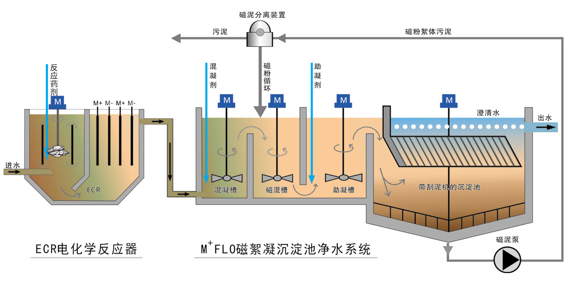 ·M+FLO磁絮凝沉淀池凈水系統 ·TT+R高效反應器+M+FLO磁絮凝沉淀池凈水系統 ·ECR電化學反應器+M+FLO磁絮凝沉淀池凈水系統